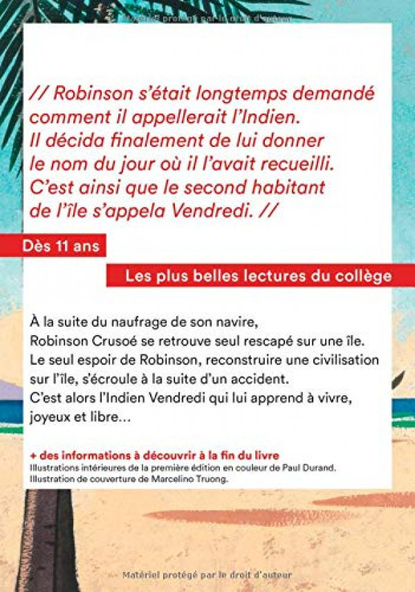 La lecture de Vendredi ou la vie sauvage permettra aux élèves de découvrir un classique du roman d'aventures (une robinsonnade), spécialement écrit pour la jeunesse, et de réinvestir les connaissances acquises au cycle 3.