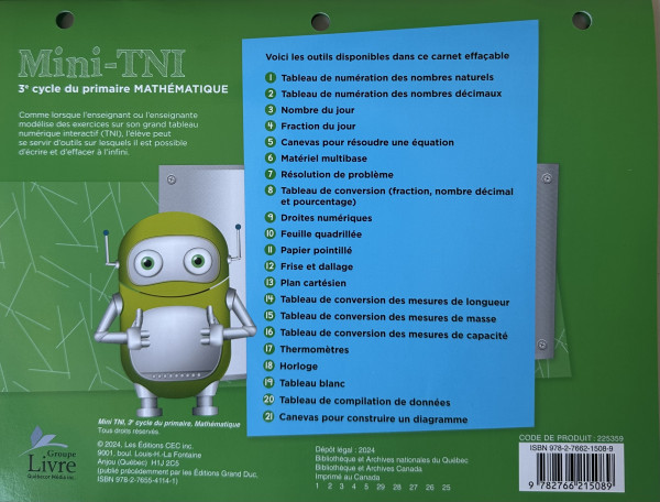 Mini TNI - Carnet effaçable autonome - 3e cycle MATHÉMATIQUE (no 225359) - ISBN 9782766215089